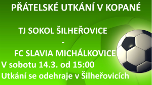 V sobotu 14.3. se od 15:00 uskuteční na fotbalovém hřišti v Šilheřovicích přátelské utkání mezi týmy TJ Sokol Šilheřovice a SK Slavia Michálkovice. Srdečně zvou pořadatelé.